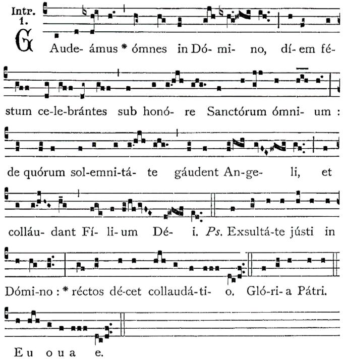 Gaudeamus omnes in Domino, diem festum celebrantes sub honore Sanctorum omnium : de quorum solemnitate gaudent angeli, et collaudant Filium Dei. Exsultate iusti in Domino, rectos decet collaudatio.