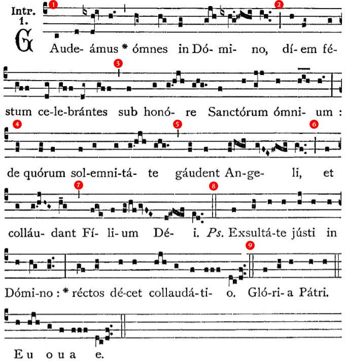 Gaudeamus omnes in Domino, diem festum celebrantes sub honore Sanctorum omnium : de quorum solemnitate gaudent angeli, et collaudant Filium Dei. Exsultate iusti in Domino, rectos decet collaudatio.